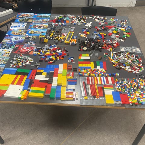 LEGO blandet lot med løse klodser og dele i forskellige farver og størrelser samt flere minifigurer og mindre byggede modeller. Sættet indeholder et mix af basis-klodser, specialdele og figurdele, som kan bruges til fri byggeleg eller som supplement til eksisterende LEGO-samlinger. Kan sendes på købers regning