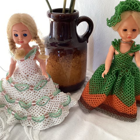 Dukker, med Perlekjoler. Samling, 36 stk i forskellig størrelser. 26 cm. 18 cm. 11 cm Ialt