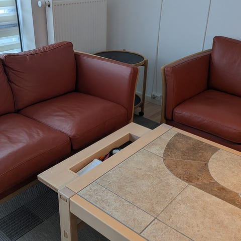 Sofa- og lænestolssæt bestående af en 3-personers sofa og en 2-personers sofa i sort læder med lyst træstel. Sofaerne har løse ryghynder og løse sædehynder. Designet er enkelt med lige linjer og åbent træstel i sider og bagkant. Velegnet til stue eller opholdsrum, hvor der ønskes et klassisk møbelsæt i læder og træ.