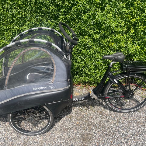 Elektrisk ladcykel fra danske Winther sælges. 5 gear som både kan bruges manuelt og automatisk. 2 polstrede sæder med sikkerhedsseler. 2 små revner ved lynlås i kalechen. 3 indstillinger for hjælp fra el-motoren. Eco, normal og high med henholdsvis ca. 130, 100 og 70 km batterikapacitet alt efter terræn. Købt ved Fri-Bike med serviceaftale som er overholdt. 3 år gammel, nypris 54.000kr.