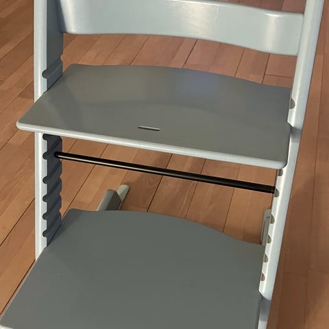 Stokke højstol i træ med justerbar siddeplade og fodplade. Højstolen har aftagelig bøjle og plastbakke, som kan ses på billederne. Egnet som spise- og siddeplads til mindre børn ved bordet. Neutralt, mørkt farvet design, der passer ind i de fleste hjem. Alle dele på billederne medfølger.