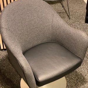 Lænestol, stof, Dansk producent, Lænestol i blå/lilla uld stof med sorte læderstropper. Pragtfuld siddekomfort. Sædehøjde: 43 cm H x 85 cm B x 92 cm D x 103 cm H.