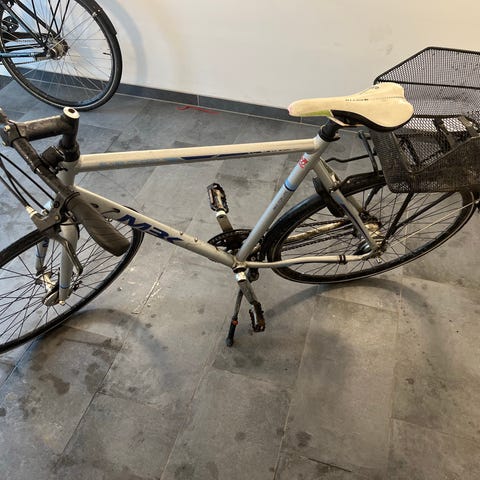 MBK hybridcykel til mænd med stelstørrelse L og 24" hjul. Cyklen har lige styr, fastmonteret kurv foran og skærme. Der er fastmonteret lås på baghjulet.