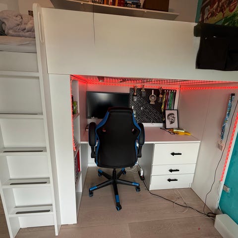 Perfekt pladsbesparende løsning med både soveplads, arbejdsstation og opbevaring samlet i ét møbel.