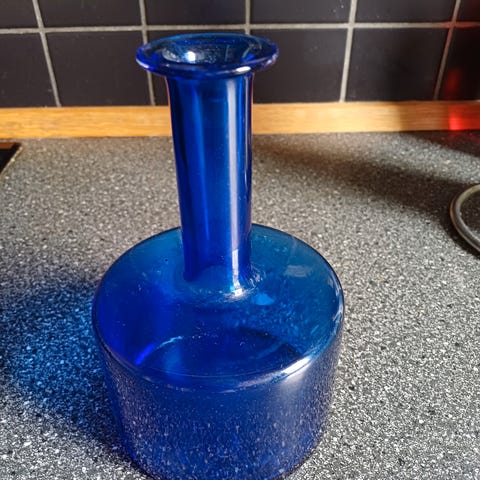 Glas, Vaser, To retro presset glas vaser (bullet-vaser), en lyseblå og en klar, ca. 15 cm høje. Pr.stk. 100 kr.