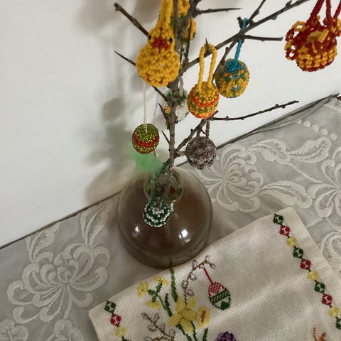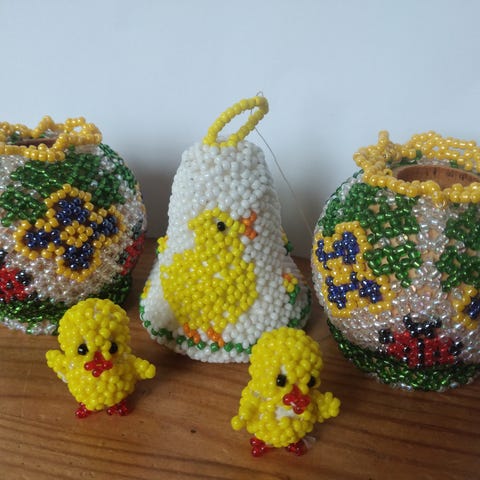 Det lidt større æg med hvid gule blomster og det stående æg koster 30 kr. pr stk.