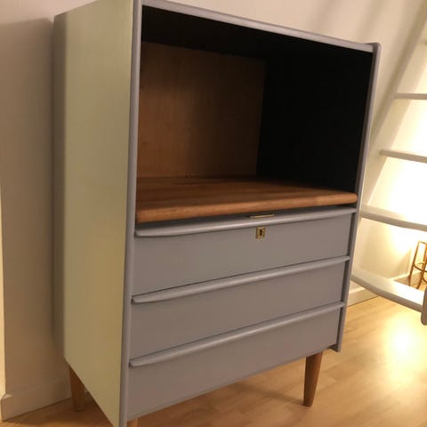 Fint og funktionelt møbel i lyst træ med hylder, skuffe og integreret holder til vinylplader. Har praktisk udtrækshylde til pladespiller.