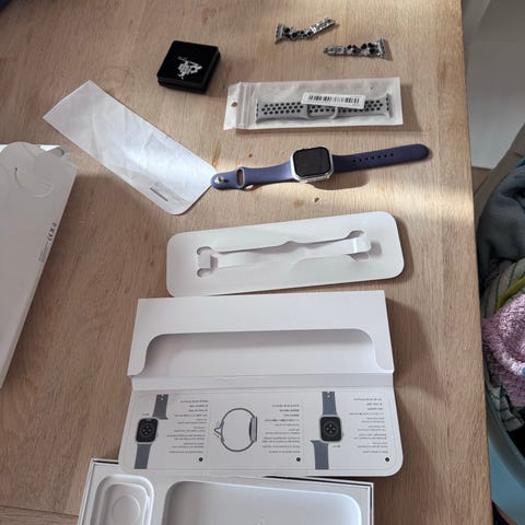 Apple Watch smartwatch med rektangulært urhus og digital krone i siden. Uret har sort skærm og bagside med sensorer. Der medfølger en tofarvet metalrem i sølv og guld med foldelås. Egnet som smartwatch til daglig brug med kompatible Apple-enheder.