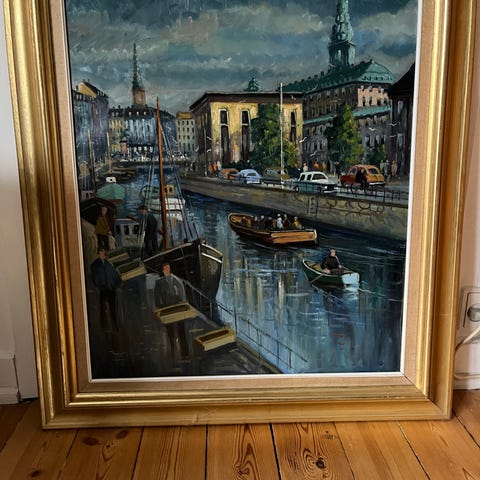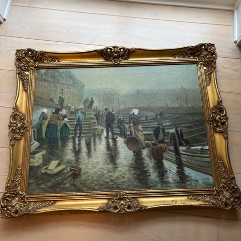 Gammel Strand med Christiansborg i baggrunden i meget velholdt og smuk ramme. 70 X 83 cm.