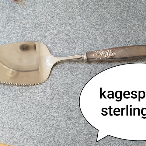Dansk arbejde. Kagespade i sølv (830) med ametyst i toppen. Længde 21,5 cm. Produceret 1928