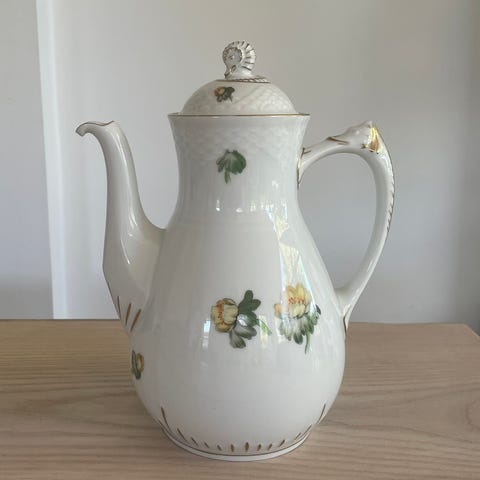 Bing & Grøndahl Erantiskaffestel i porcelæn med blomstermotiv og guldkant. Sættet omfatter blandt andet kaffekande, sukkerskål med låg, lille vase, kopper med underkopper samt små tallerkener.. Stellet er hvidt med erantis. Fremstillet i Danmark, mærket Bing & Grøndahl under bunden. Sælges for højeste bud.