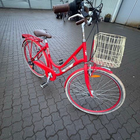 Velkørende rød damecykel med 3 indvendige gear. Har lige været til service og fået ny kæde og ny sadel på. Der er fod-og håndbremse, støttefod, klokke og reflekser. På styret er der en frontkurv. Der er kvittering på cyklen. ( Kædelås kan medfølge )