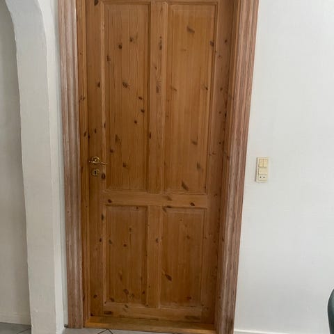 3 stk. Fyldningsdøre til indvendig brug. Dørene har klassisk fyldningsdesign og er udført i lyst træ med synlig årestruktur. Velegnet som indvendig dør i bolig, fx mellem rum eller til værelse. Med hængsler og dørgreb som på billederne.