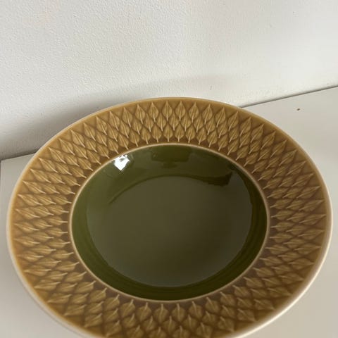 Bing & Grøndahl tallerkener i stentøj/porcelæn med brun og blå dekoration langs kanten. Tallerkenerne har glaseret, lys indvendig flade og mørkere kant med mønster. Egner sig til brug som spise- eller frokosttallerkener i køkken og spisestue. Stempler på undersiden angiver Bing & Grøndahl Denmark.dyb tallerken har 19 stk