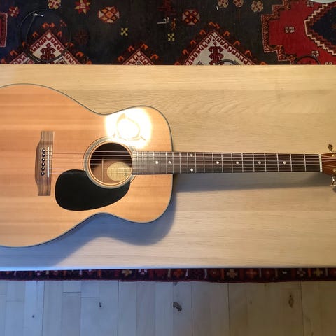 Blueridge BR-63 akustisk guitar i naturtræ. Westerntype med stålstrenge og rund lydhul. Kroppen har blank finish med tydelig åretegning på bagside og sider. Gribebræt med dot-inlays og 20 bånd. Hoved med Blueridge-logo, dekorativ indlægning og kromfarvede stemmeskruer. Velegnet til både akkordspil og fingerspil i forskellige genrer.