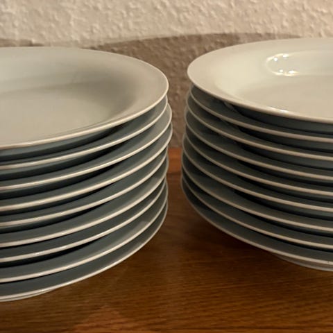 Bing & Grøndahl St. Chamaine tallerkener i porcelæn. Tallerkenerne har en dekoration med brun og blå kant samt lys midte. Velegnet som frokost- eller desserttallerkener i et stel fra Bing & Grøndahl i serien St. Chamaine.har 11 stk