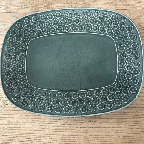 Bing & Grøndahl stentøj fade i rektangulær form. Fade i glaseret stentøj med lys indvendig flade og kant i brunlige og blå nuancer. Egnet til servering af mad på bordet eller som ovnfaste fade, afhængigt af producentens anvisninger. Sættet består af to fade i forskellige størrelser, som kan bruges til fx kød, grøntsager eller anretninger ved hverdag og gæstemiddage.har 2 stk