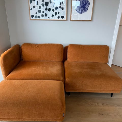 Selve sofaen består af to moduler som kan skilles ad. Farven er mørk orange.