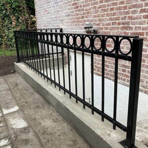 Det har stået ved et gammelt nonnekloster i deres have. dekorativt hegn med ornamenteret mønster. Segmenterne har lodrette stænger og buede detaljer, som kan anvendes til afgrænsning af bede, stier eller mindre områder i haven. Egnet til udendørs brug som lavt havehegn eller kantafgrænsning.