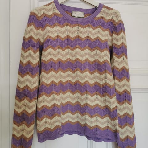Neo Noir sweater til kvinder i størrelse M. Strikken er i sort med mønster og er fremstillet i viskoseblanding ifølge mærket. Langærmet model med rund hals. Velegnet som hverdagsstrik eller til lag-på-lag outfits.med guld glimmer.