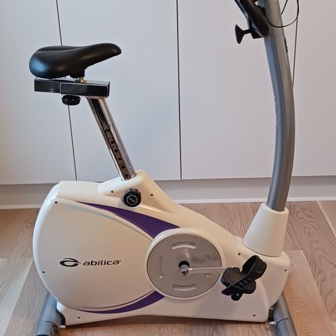Abilica motionscykel med indbygget træningscomputer. Cyklen har et display, der viser blandt andet tid, distance, hastighed og kalorieforbrug. Styret har håndtag med mulighed for forskellige greb, og sadlen kan justeres i højden for bedre tilpasning. Pedalerne er udstyret med remme, som hjælper med at holde fødderne på plads under træning. Farven er grå med sorte detaljer, og cyklen er egnet til indendørs konditionstræning i hjemmet.