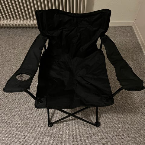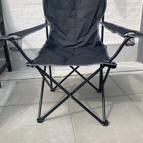 Festival stol med lidt skæve voksen tegninger med tekst på ryglænet.