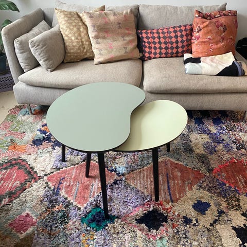 Sofabord i bønneform i hvid med lyse træben. Målene er angivet i forhold til det bredeste stykke (118 cm) og det længste stykke (60 cm).