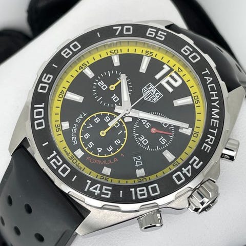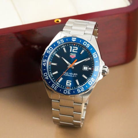 TAG Heuer Formula 1 Date WAZ1120 herreur med blå skive og datoangivelse. Uret har drejekrans og tydelige timemarkeringer. Urkassen og lænken er i kombination af stål og guldfarvet metal med foldelås. Analog visning med time-, minut- og sekundviser. Designet til mænd og egnet som hverdags- og dress-ur. Det har et par brugsridser, men virker præcis som det skal.