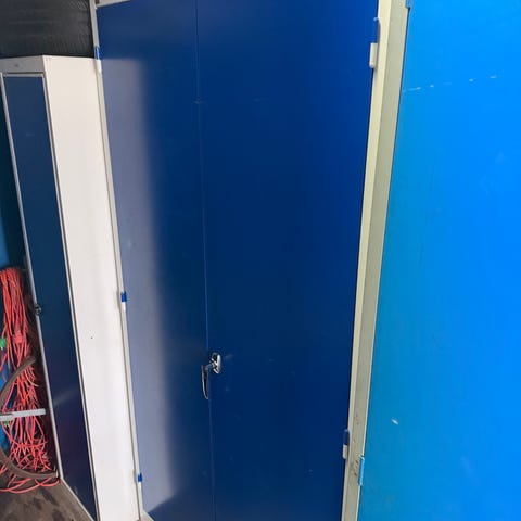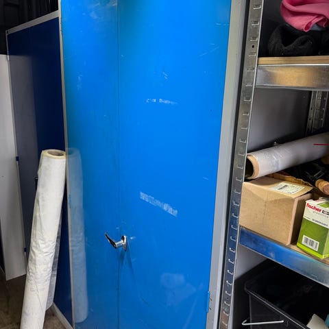 Dobbelt metalskab med hylder.