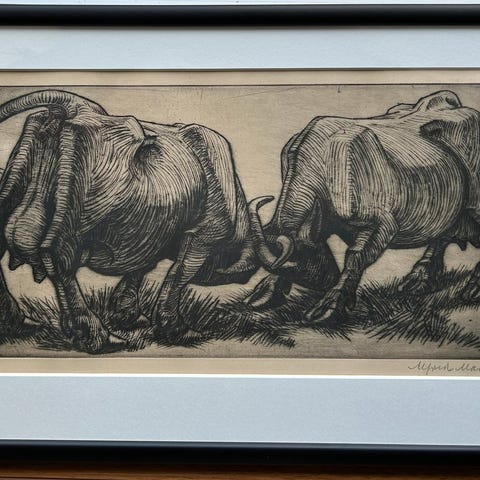 Gouache/pastel på karton. Signeret i monogram EM. Lysmål 24,5 cm x 30,5 cm. Mål inkl. ramme 28 cm x 34 cm. Indrammet bag glas. Meget velholdt. Dekorativ ramme med sølvbronze, nogle få skrammer. Motivet er sandsynligvis fra København, måske Amager. c1950. Kan sendes for kr. 60 til pakkestation.