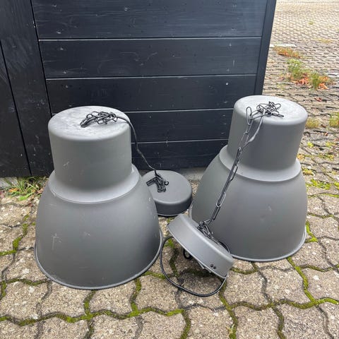 IKEA loftlamper sæt i metal. Sættet består af pendel/loftlamper i en neutral, mørk metalfarve. Lamperne har ledning og loftdåse/afdækning monteret og egner sig til ophæng over f.eks. spisebord, køkkenbord eller i opholdsrum. Materiale: metal. Farve: mørk/neutral metalfarve.