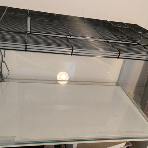 Flot, lille hamsterbur i glas og sort metal