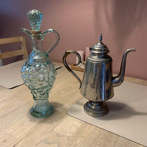 Lille antik øse eller flødekande i sølvplet m. træhåndtag