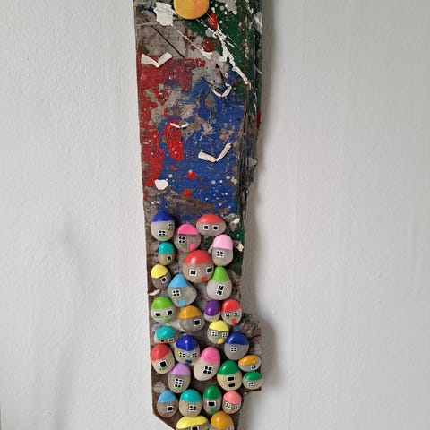 Drivtømmer med huse af sælskind, Dekorativt drivtømmer med 2 stk. mini huse beklædt med grønlandsk sælskind. Træhusene er 8 cm høje og beklædt hele vejen rundt. Husene laves i 20 forskellige farver og der er frit valg (se palette). Prisen kr. 140 pp. Drivtømmeret er fra naturens side forskelligt. Perfekt til reolen eller vindueskarmen. Modellen på billedet er solgt, men jeg laver gerne flere.