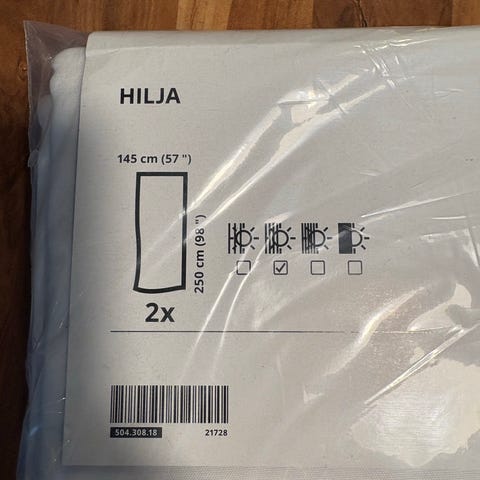 2 stk. fine hvide gardiner fra Ikea i modellen Hilja. Gardinerne er lysfiltrerende og fungerer rigtig godt som et simpelt gardin alene eller i kombination med et mørklægningsgardin.