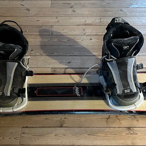 RS snowboard med bindinger. Brættet har perlemors overside med blomster- og grenmotiv samt sort underside med RS-logo. Bindingerne er hvide med justerbare stropper. Velegnet til alpint snowboardbrug.
