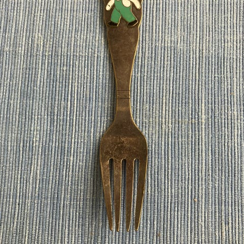 Gaflen måler 26 cm og har et elegant, glat sort træskaft (formentlig ibenholt eller tilsvarende hårdttræ). Kombinationen af det mørke skaft og den levende kobberpatina giver et smukt og dekorativt helhedsindtryk.