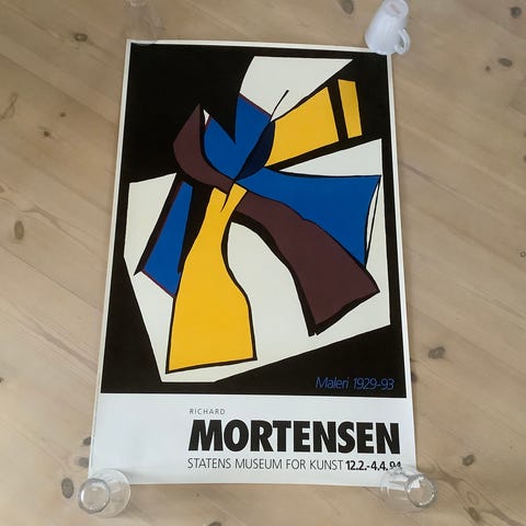 med abstrakt, geometrisk motiv i flere farver. Plakaten er indrammet i en enkel ramme med glas/front og ophæng på bagsiden.