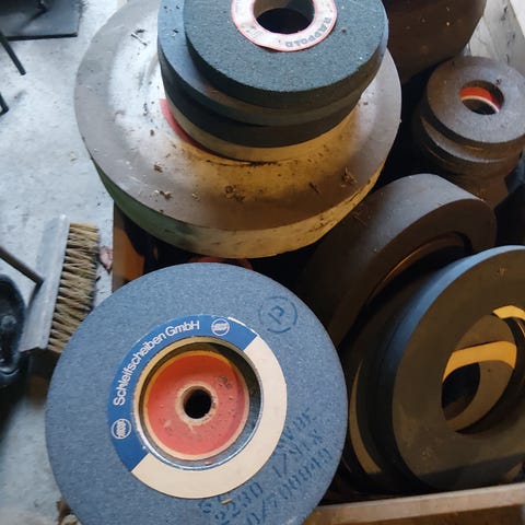 Parti slibeskiver og sliberondeller i blandede størrelser og tykkelser. Skiverne har centerhul og er velegnede til brug på stationære slibemaskiner eller andre maskiner, der passer til dimensionerne. Flere typer og diametre er repræsenteret, som det fremgår af billederne