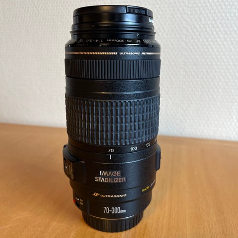 Canon 75-300mm telezoom med lynhurtigt autofokus (USM). Der er en lille ridse på kanten af front glas (som ikke rigtigt ses på billeder), deraf lav pris.