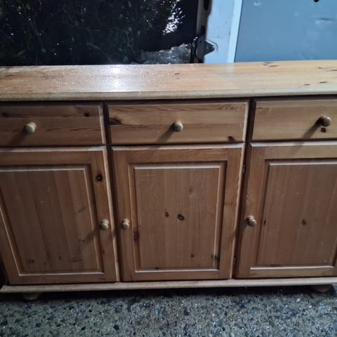 Skænk i massiv fyrretræ skal sælges billigt og hurtigt Giv et bud fremstår ren og pæn og stærk og funktionel nederste skuffe kører dog ikke så godt og trænger til en kærlig hånd dybde med håndtag 40 cm og højde 75,5 cm bredde 155 cm jeg kan måske hjælpe med levering