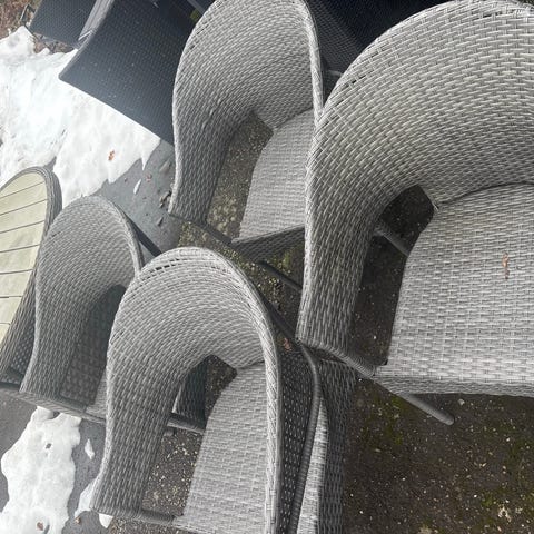 IKEA havemøbelsæt bestående af et bord og 4 stole. Ca. mål på bord: længde 143 cm, bredde 75 cm, højde 73 cm. Stolene har armlæn og lamelsæde/-ryg i samme træ som bordet.