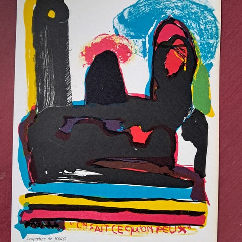 Litografi med abstrakt motiv i ramme. Billedet viser et farverigt, geometrisk motiv med blandt andet gule, røde og blå nuancer. Trykket er monteret i en lys passepartout og indrammet i en enkel, lys ramme med glas. Velegnet til ophængning i stue, kontor eller andre rum, hvor der ønskes et moderne, grafisk udtryk på væggen.