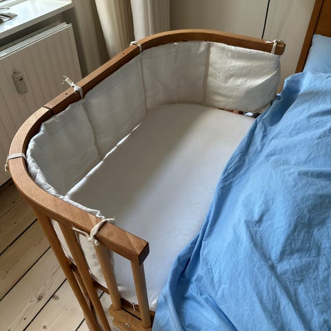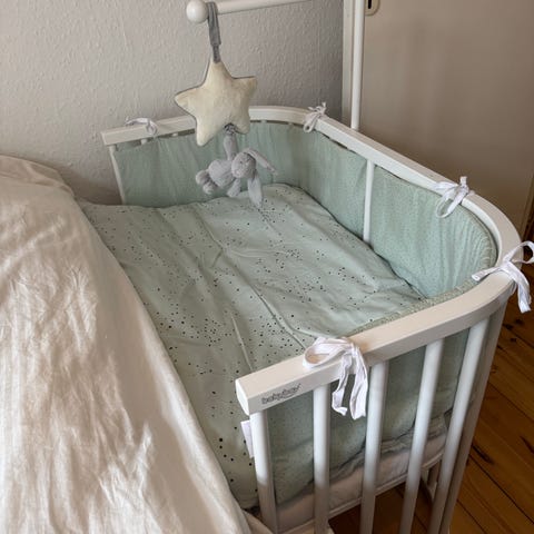 Vi sælger en Babybay Bedside Crib (Maxi) – den store model. Standen er god med tegn på almindelig brug. Der er en lille revne i det ene hjørne (se billede nr. 2), men det har ikke betydning for brugbarheden. Sengen er fra et røg- og dyrefrit hjem.