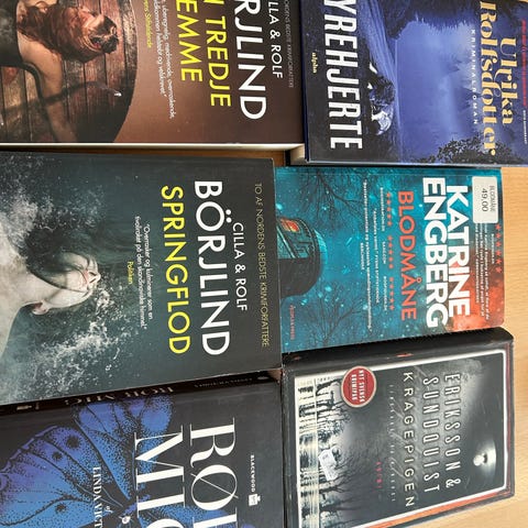 Samling af blandede bøger af forskellige forfattere, primært inden for krimi- og spændingsgenren samt enkelte romaner og biografiske fortællinger. På billederne ses blandt andet titler af Lars Kepler, Sara Blædel, Liza Marklund, Elsebeth Egholm, Camilla Läckberg, Mari Jungstedt, Katrine Engberg, Jussi Adler-Olsen samt flere virkelighedsnære beretninger og en roman af Danielle Steel. Bøgerne er hovedsageligt danske udgaver i paperback og hardback. Velegnet til læsere, der ønsker et udvalg af nordiske krimier, spændingsromaner og personlige historier i fysisk bogformat.