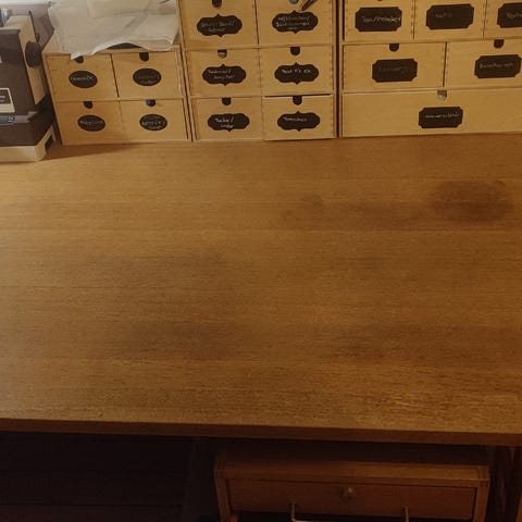 Stort arbejdsbord i træ med rektangulær bordplade. Bordet har åbne opbevaringshylder under bordpladen, som giver god plads til opbevaring af kasser, stof eller materialer. Velegnet som sybord, hobbybord eller arbejdsbord i sy værelse eller hobbyrum. Overfladen viser få brugsspor, men bordet fremstår funktionelt og stabilt. Bordet er af massiv karakter. Bordets størrelse måler H 86cm, L 260cm og B 123cm.