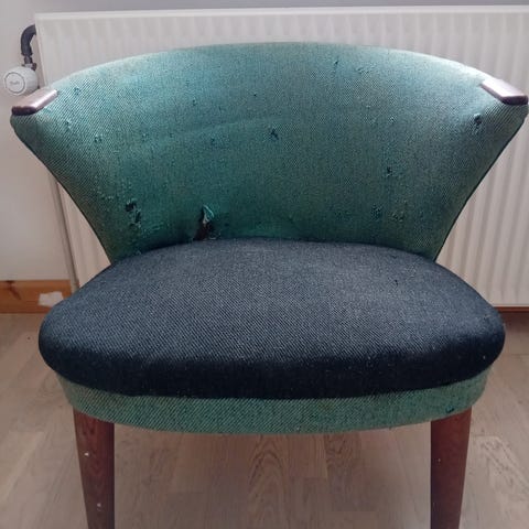 1 stk brugt lænestol med negle, designet af Bent Møller Jepsen model TV-stol for Simo, Formgivet i 1956. Stolen har fået en ompolstring og nye gjorder i bund. Stolen står flot. B:70cm. D:49cm. H:72cm. SH:39cm. Stolen er ikke ny og sælges derfor som brugt, derfor kan der forekomme ridser, slid og skrammer. Prisen er kun 4.500kr.