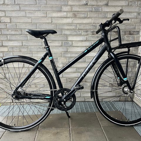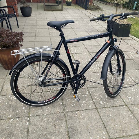 MBK herre citybike med 58 cm stel og 28"/700c hjul. Cyklen har tromlebremser for og bag samt 8 udvendig gear med Shimano 105 bagskifter. Udstyret med bagagebærer, skærme, lås og ny støtteben, ny kæde ny dunkholder ny forlygte ny baglygte og nye pedaler serviceret og smurt egnet til daglig pendling og bykørsel for mandlig rytter med en højde på ca 180-190 cm. Farven sort.