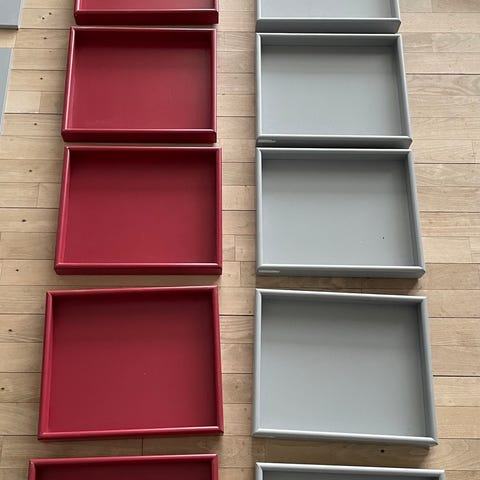 Montana Arrange bakker i forskellige størrelser og farver. Rektangulære bakker måler ca. 44,5 x 27,5 cm og 44,5 x 35,5 cm, og kvadratiske bakker måler ca. 21,5 x 21,5 cm. Bakkerne er i hårdt materiale med ensfarvet overflade i flere nuancer, velegnede som serveringsbakker eller til opbevaring og dekoration i hjemmet.
