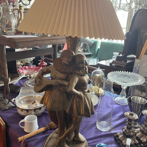 Charlie Chaplin bordlampe. Lampen forestiller en siddende chaplin med bowlerhat og en hund ved siden af, placeret på en sokkel. Lampen har lysarmatur bag figuren. Velegnet som dekorativ belysning i stue, værelse eller entré.